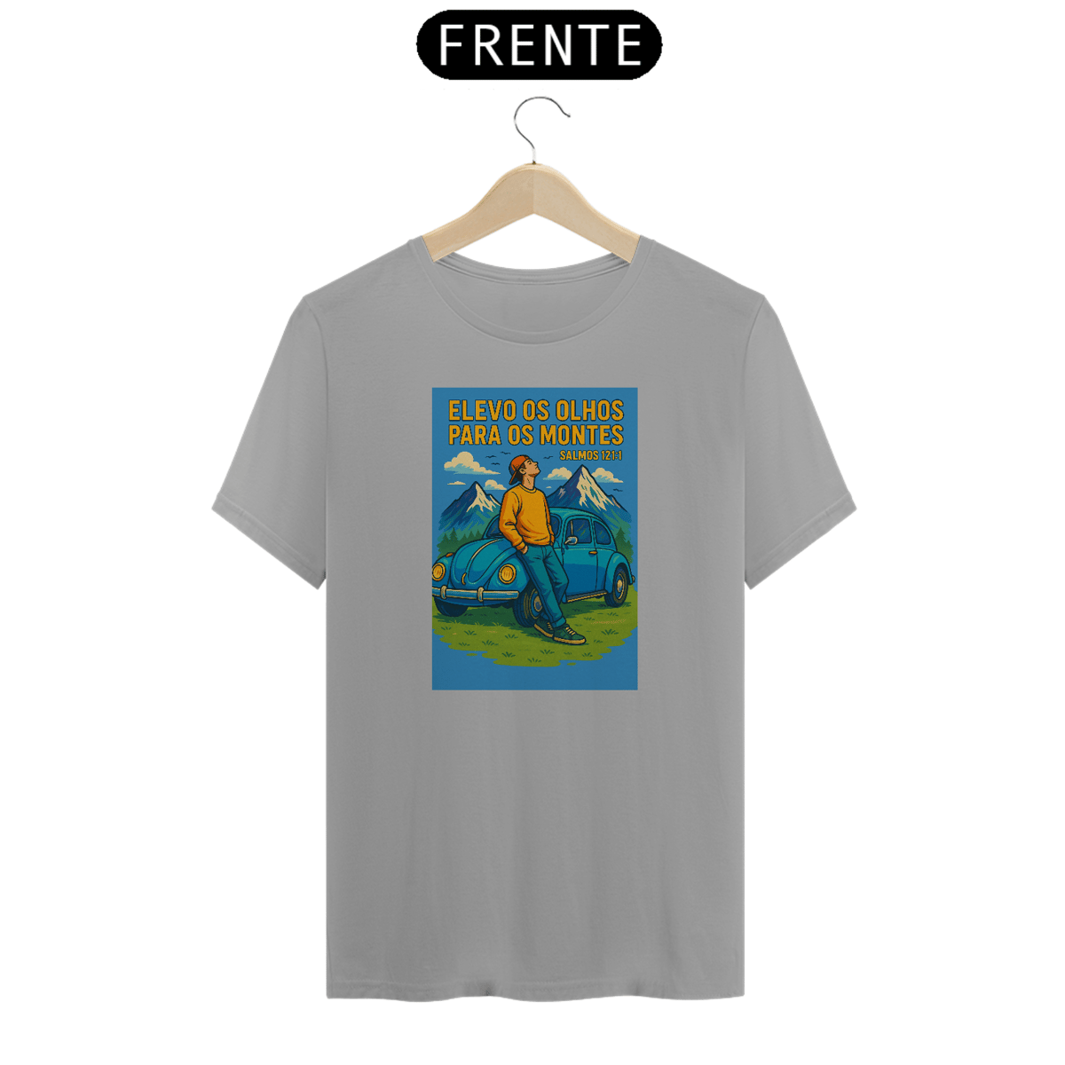 Nesta estampa urbana, a fé encontra a arte de rua em um cenário que carrega propósito. Inspirada em Salmo 121:1 – “Elevo os olhos para os montes: de onde me virá o socorro?”, a ilustração mostra um personagem contemplativo encostado num fusca azul, olhando para o alto. Um convite visual à reflexão, esperança e confiança naquele que nunca falha. Estilo street, essência eterna. Vista-se com fé.