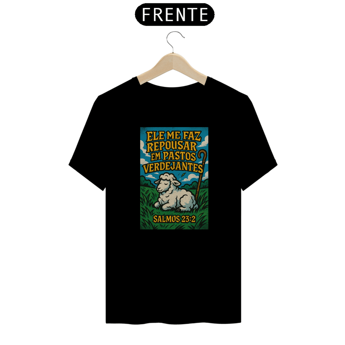 Com traços urbanos e cores vibrantes, essa estampa traz uma ovelha tranquila sob o cuidado do Bom Pastor, mesmo em meio ao caos do mundo.